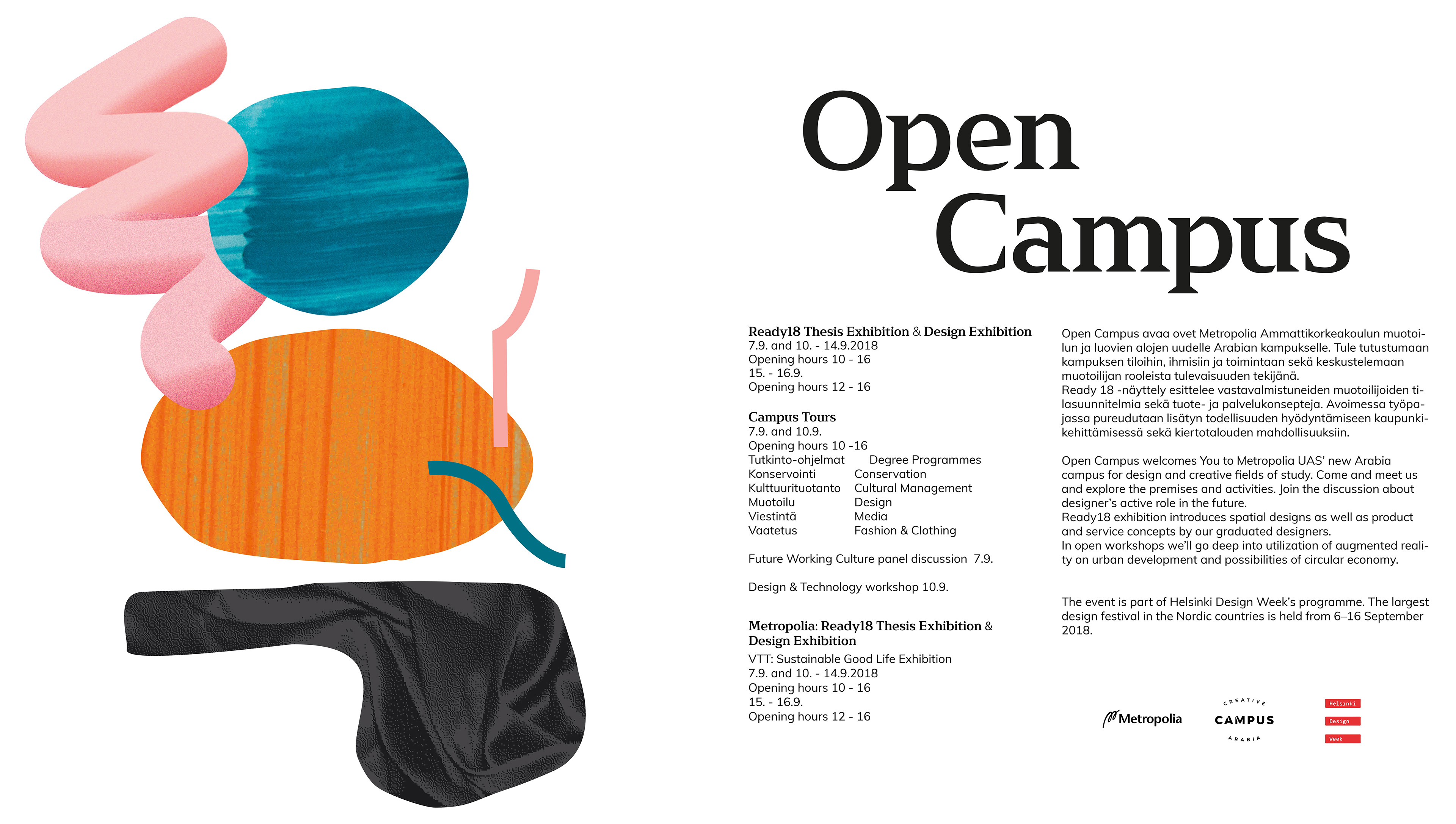 Metropolialle yhdessä Noora Karjalaisen ja Ulla Timosen kanssa toteuttamamme näyttelyn ilme Helsinki Designweekillä järjestetylle Open Campus tapahtumalle. Näyttelyn ilme piti sisällään julisteet, planssit, teippaukset yms.